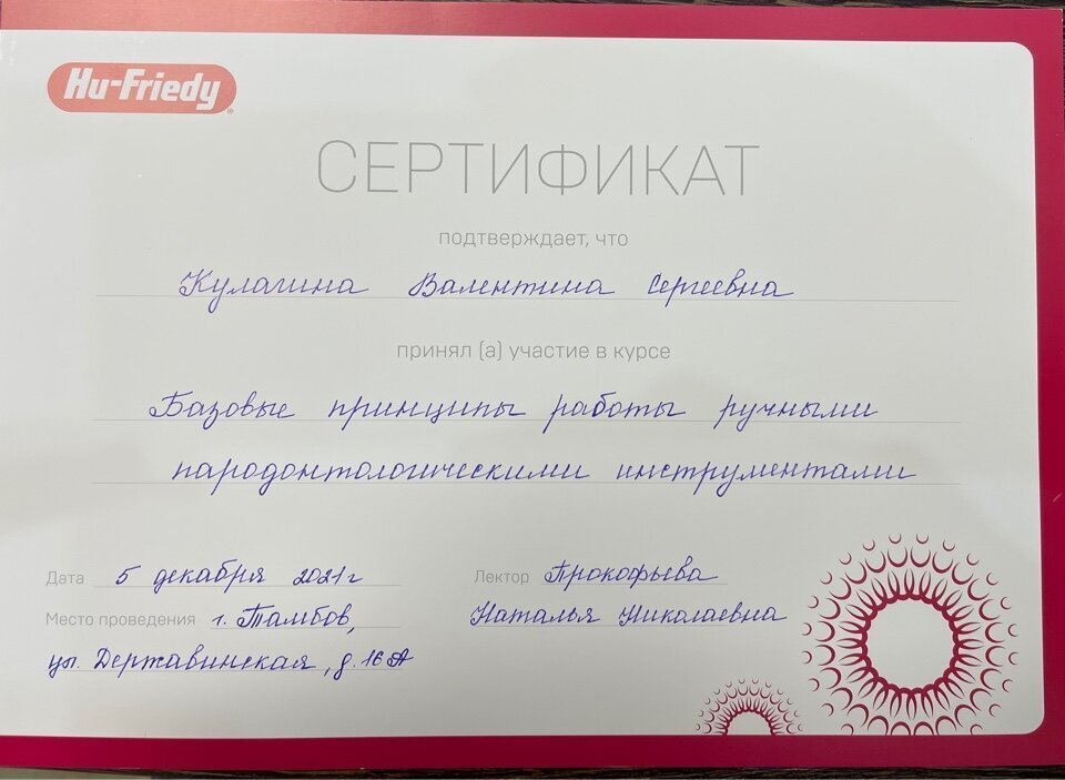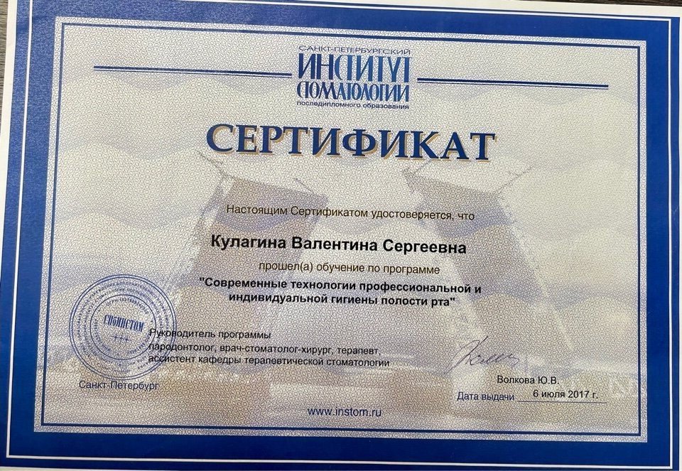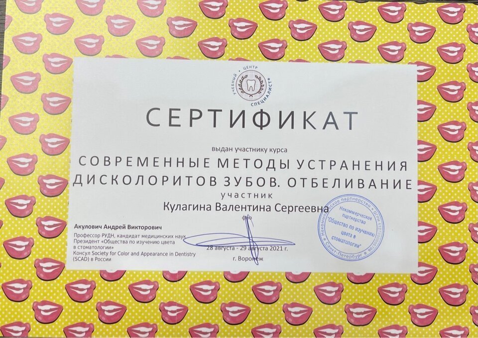Кулагина Валентина Сергеевна является стоматологическим гигиенистом. Ее помощь может потребоваться вам перед лечением зубов от кариеса или других патологических процессов, а также как средство для профилактики опасных болезней десен. Базовые услуги, которые оказывает Валентина Кулагина - это удаление зубного камня, реминерализация и полировка эмали.