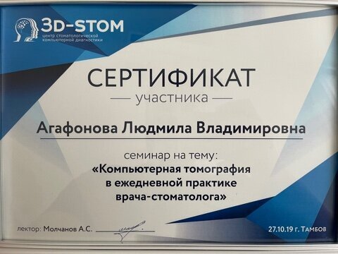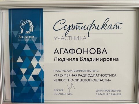 Агафонова Людмила Владимировна является стоматологом-терапевтом. Вы можете обратиться к нему не только если вас беспокоит состояние зубов, но и при патологиях десен и других слизистых оболочек рта.